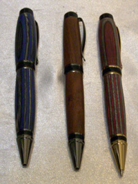 I am selling a lot of pens through my shows and having problems keeping specific pens in stock for the web site. I make pens in dozens of different kinds of woods and colors of dyed birch veneer. To give you the best selection and quickest turnaround on your order, after you have decided on what type of pen you want, send me an e-mail indicating what type of pen you want and I will send you a photo of the pens currently in stock for you to select from. This process is more complicated, however it gives you the best selection of pens to choose from and guarantees fast turn around on your order.